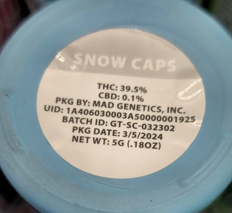 Before lighting up, here are the essential 2026 specs for the Mad Labs Snow Caps flower: